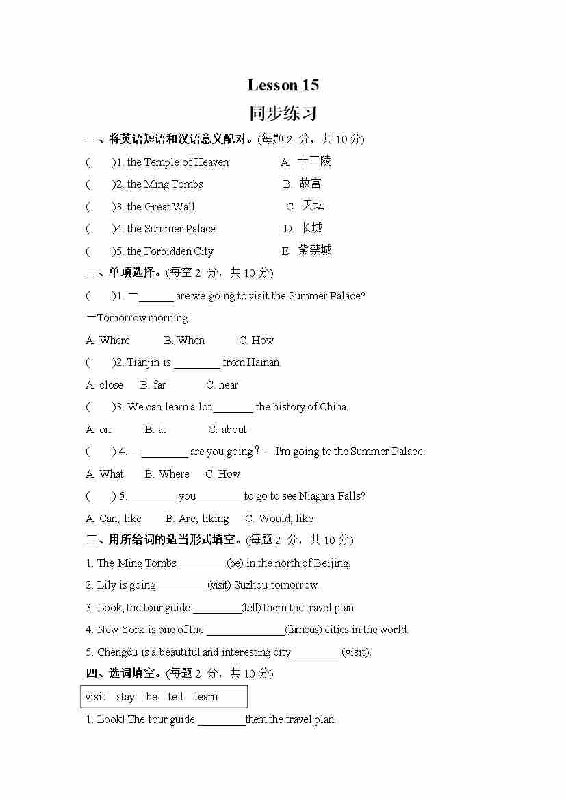 Unit 3 We are going to travel.Lesson 15 (同步练习) 人教精通版英语六年级下册