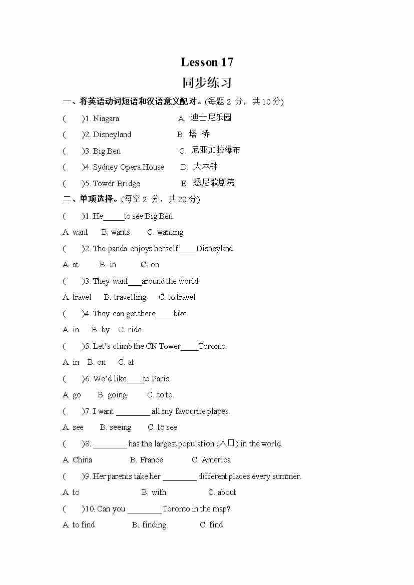 Unit 3 We are going to travel.Lesson 17 (同步练习) 人教精通版英语六年级下册
