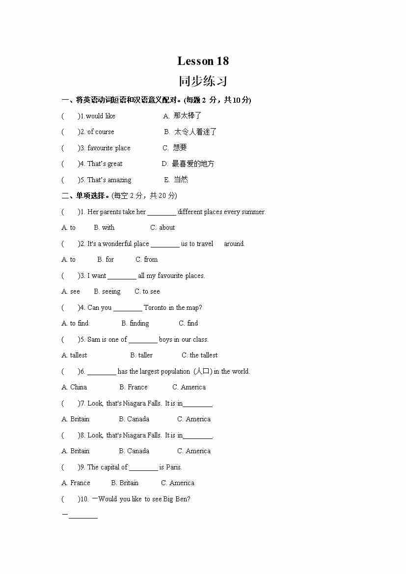 Unit 3 We are going to travel.Lesson 18 (同步练习) 人教精通版英语六年级下册