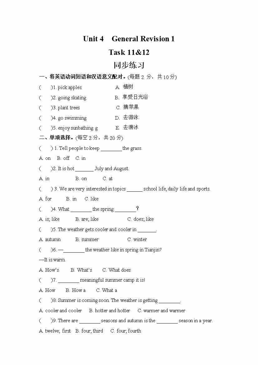 Unit 4 General Revision 1 Task 11&12(同步练) 人教精通版英语六年级下册