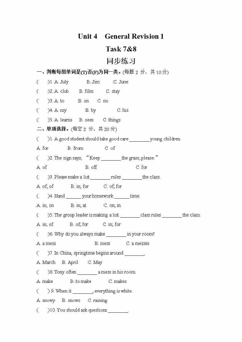 Unit 4 General Revision 1 Task 7&8 (同步练) 人教精通版英语六年级下册