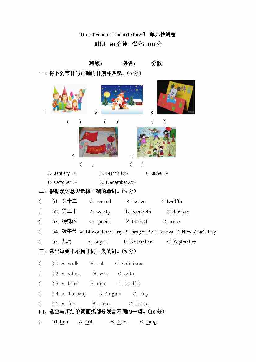五年级下册英语单元检测卷-Unit 4 When is the art show 人教PEP(word版,含答案)_new