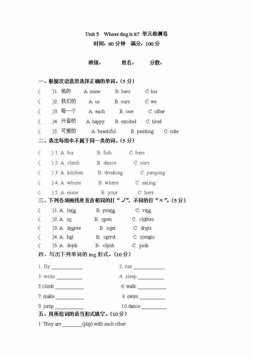 五年级下册英语单元检测卷-Unit 5 Whose dog is it人教PEP(word版,含答案)_new