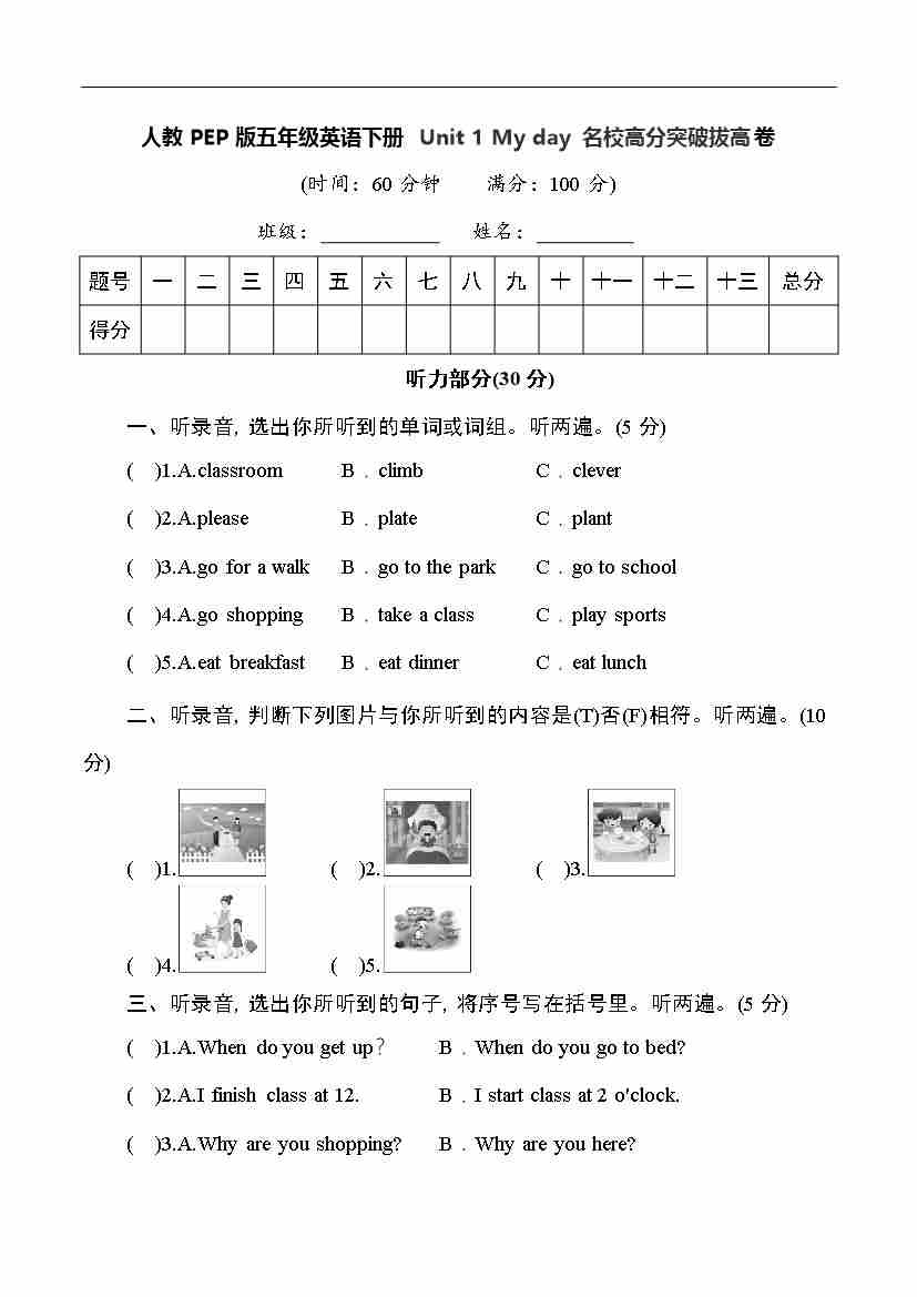 人教PEP版五年级英语下册 Unit 1 My day 名校高分突破拔高卷(学生版)