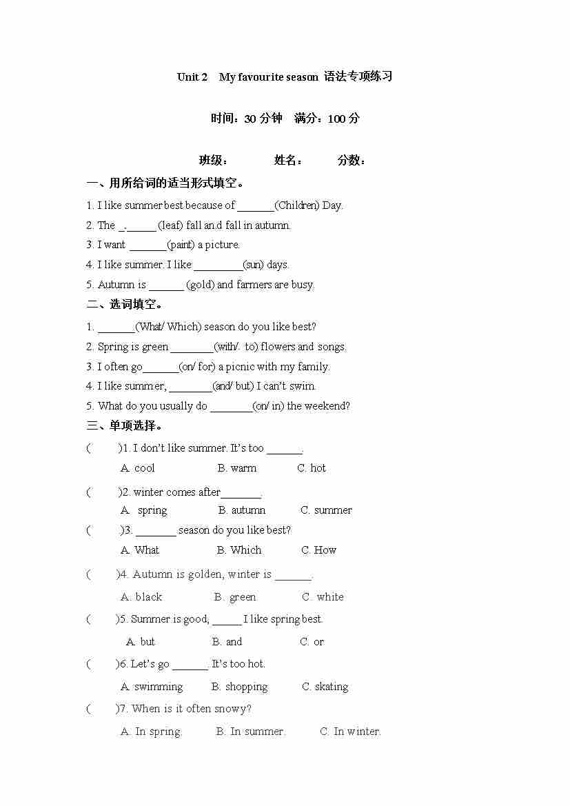 【核心语法】五年级下册英语单元语法专训-Unit 2 My favourite season 人教PEP(含答案)_new