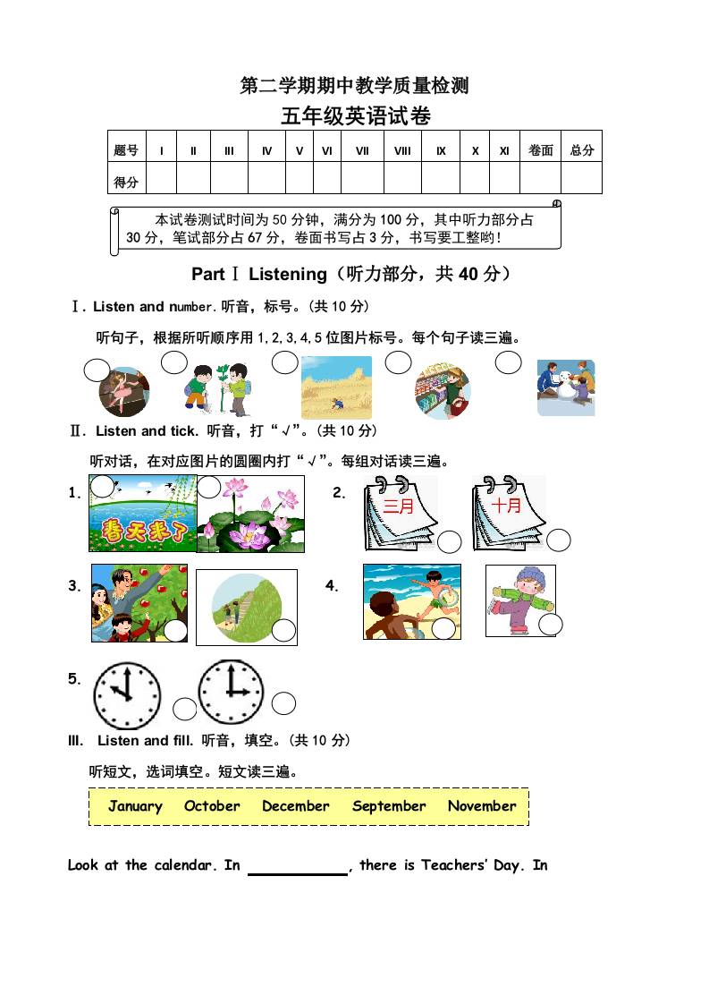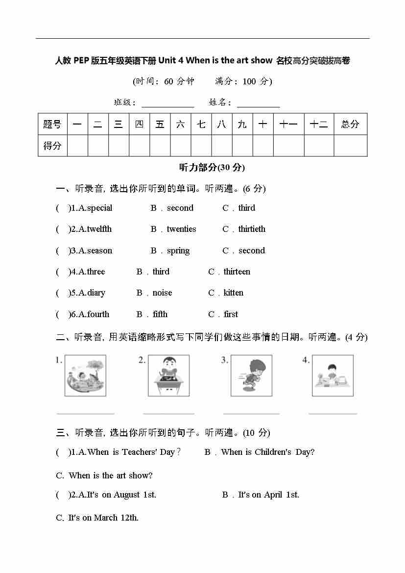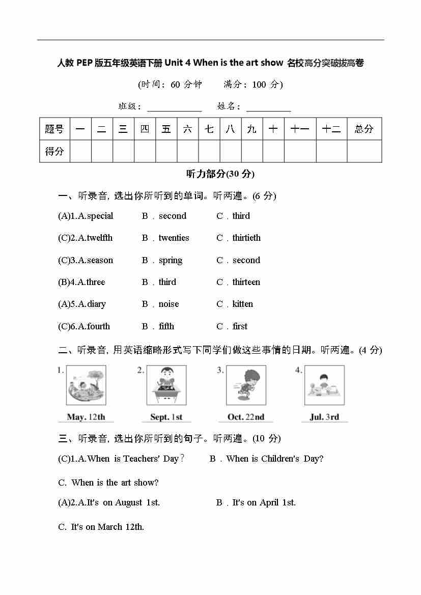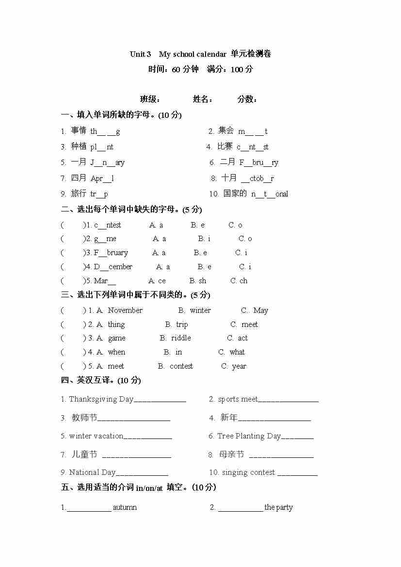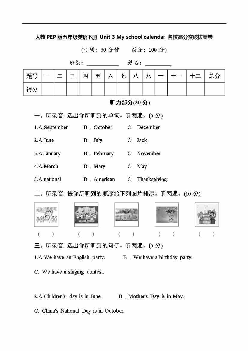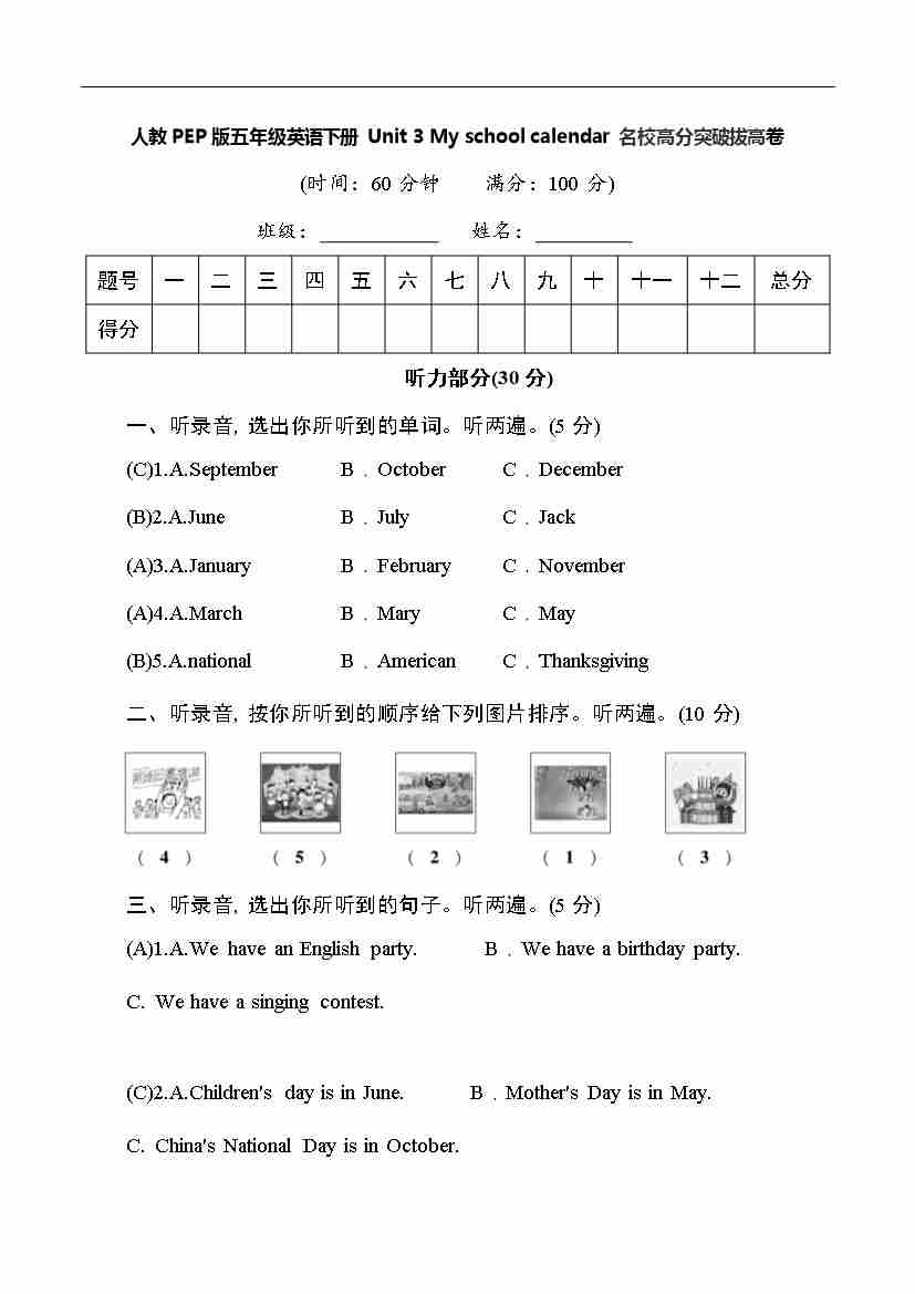 五年级下册英语单元检测卷-Unit 3 My school calendar 人教PEP(word版,含答案)_new