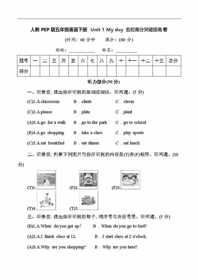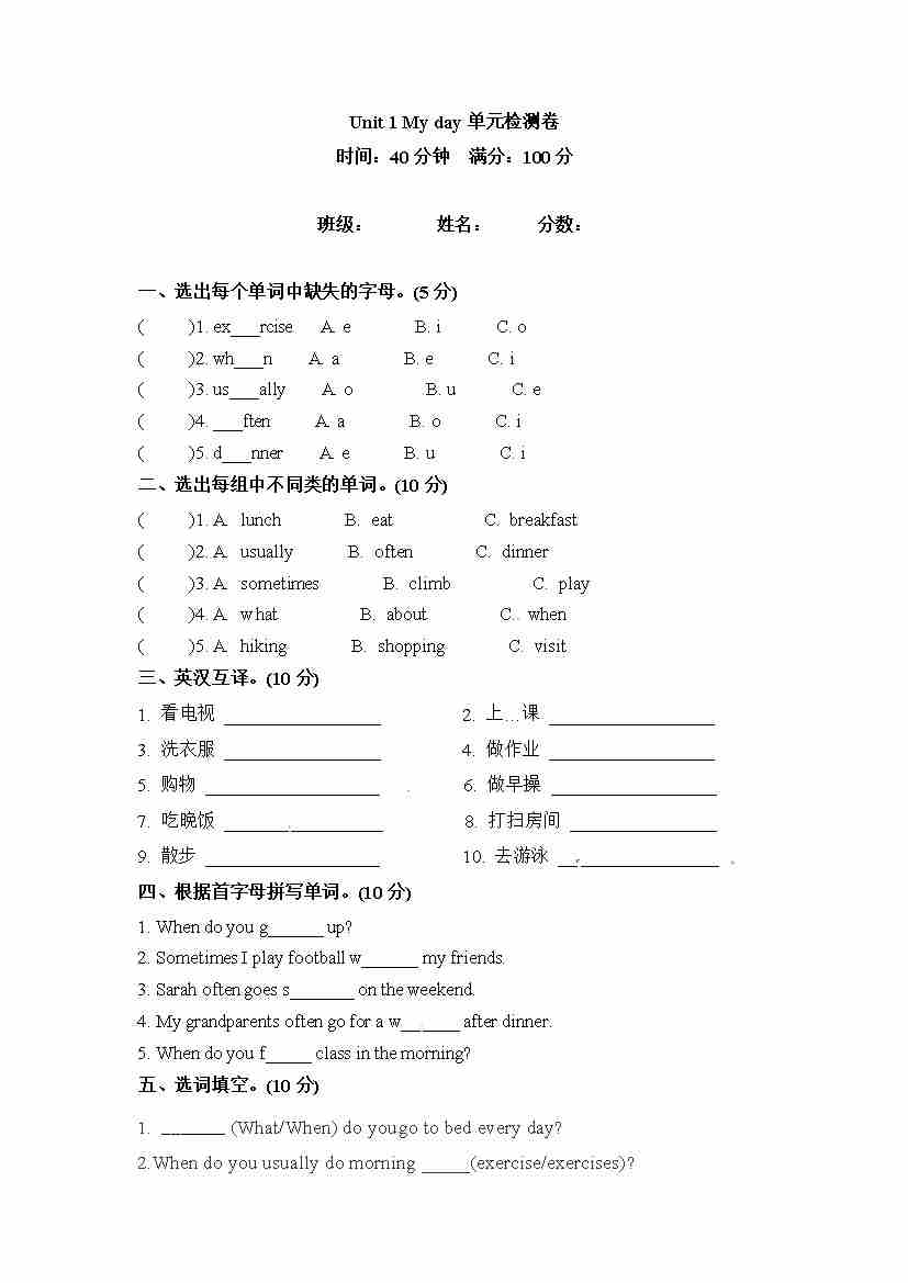 五年级下册英语单元检测卷-Unit 1 My day人教PEP(word版,含答案)_new