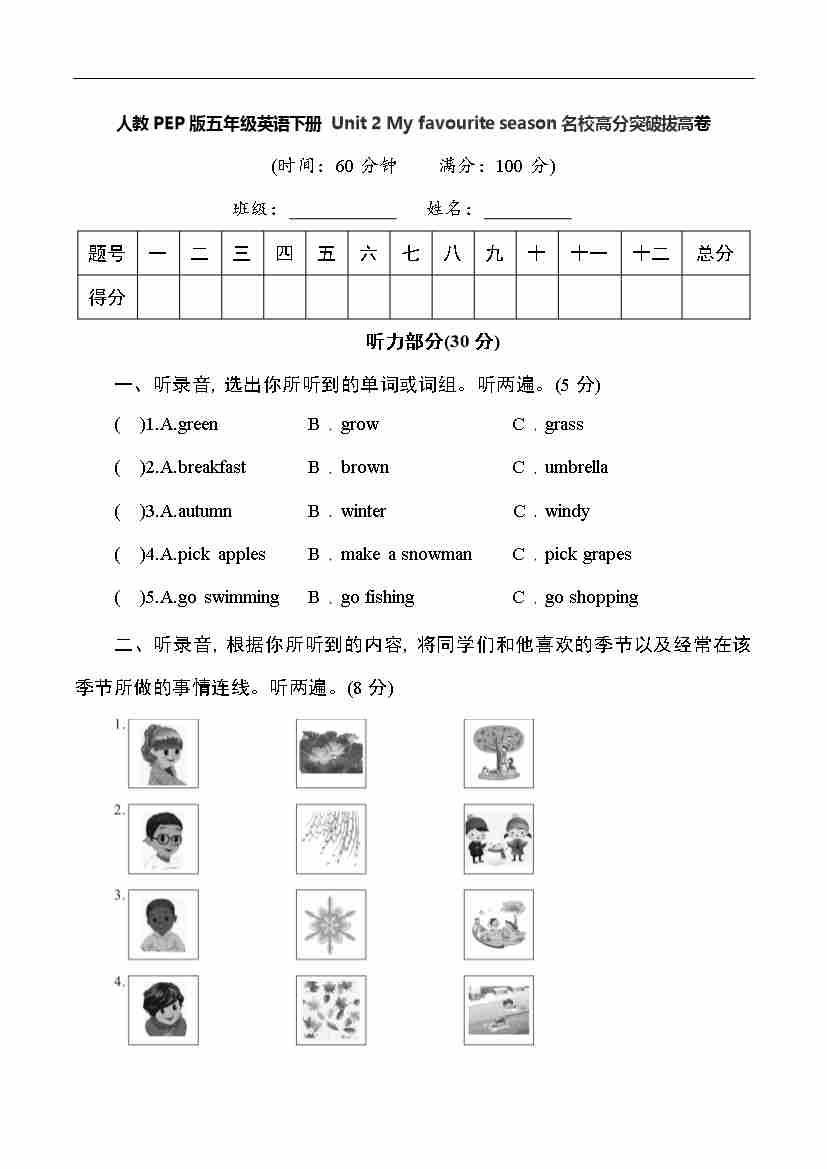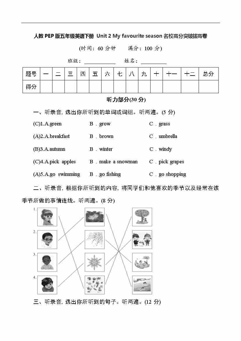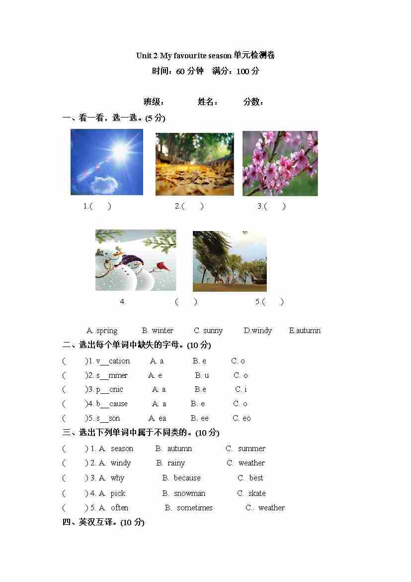 五年级下册英语单元检测卷-Unit 2 My favourite season 人教PEP(word版,含答案)_new