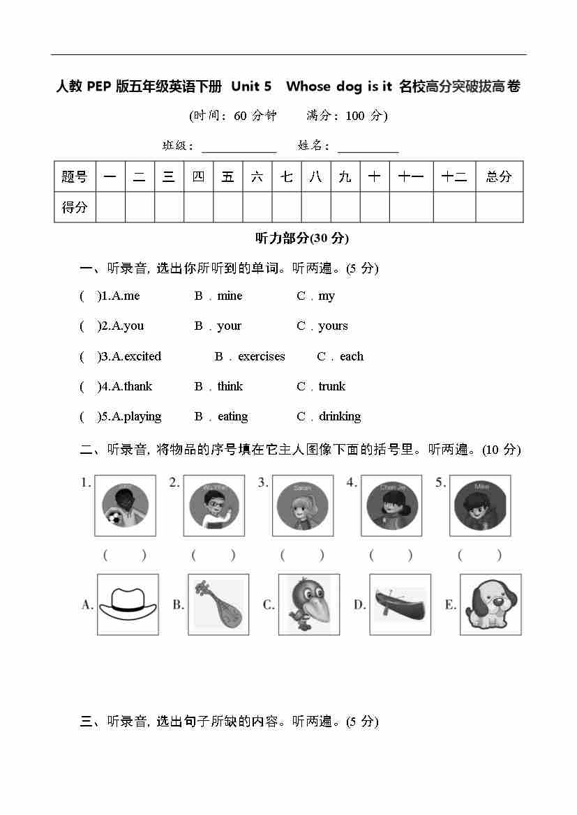 人教PEP版五年级英语下册 Unit 5 高分突破拔高卷(学生版)