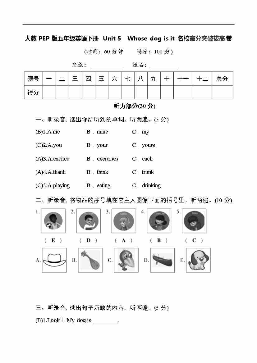人教PEP版五年级英语下册 Unit 2 高分突破拔高卷(学生版)