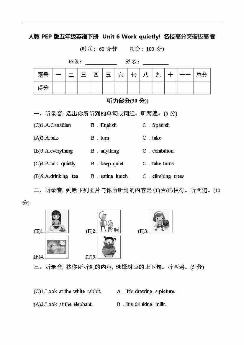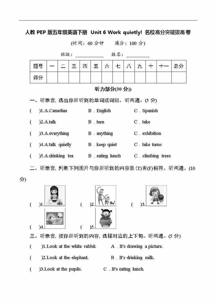人教PEP版五年级英语下册 Unit 6 Work quietly! 名校高分突破拔高卷(学生版)