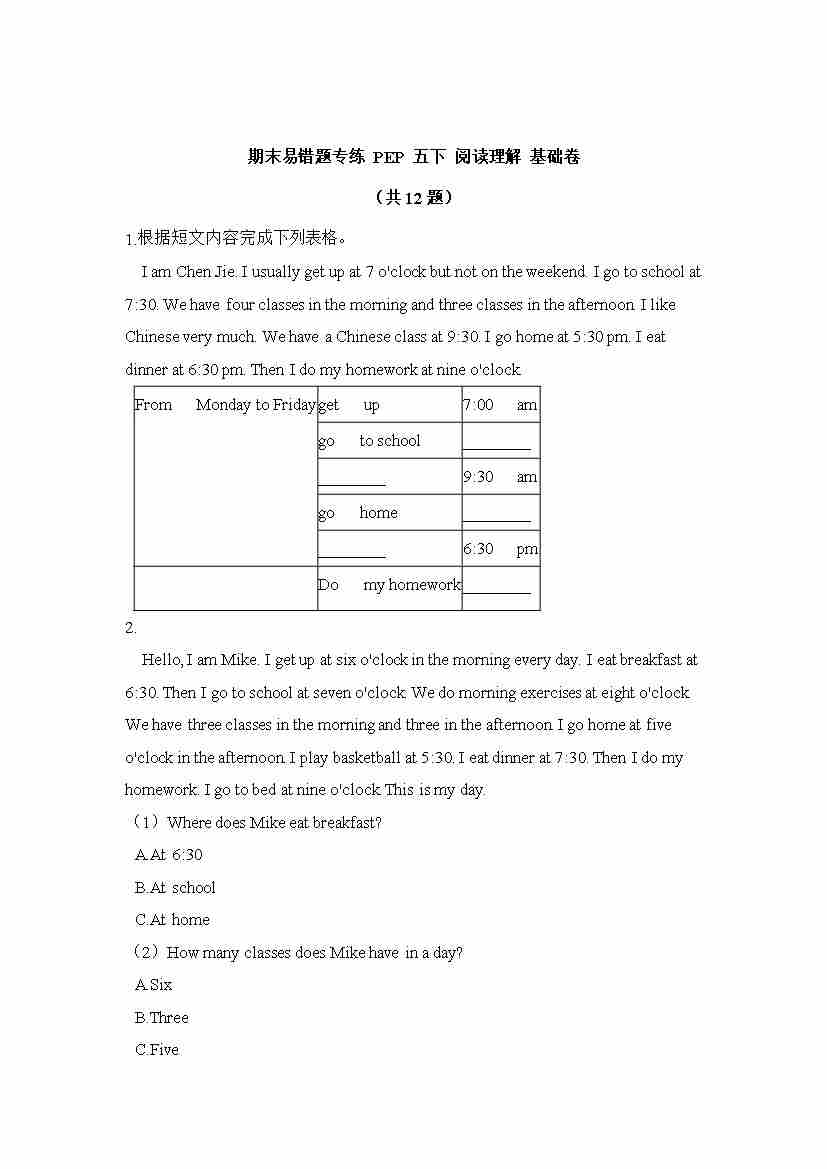 【期末易错题专攻】【基础卷】 五下英语 阅读理解 (含答案 人教pep)_new