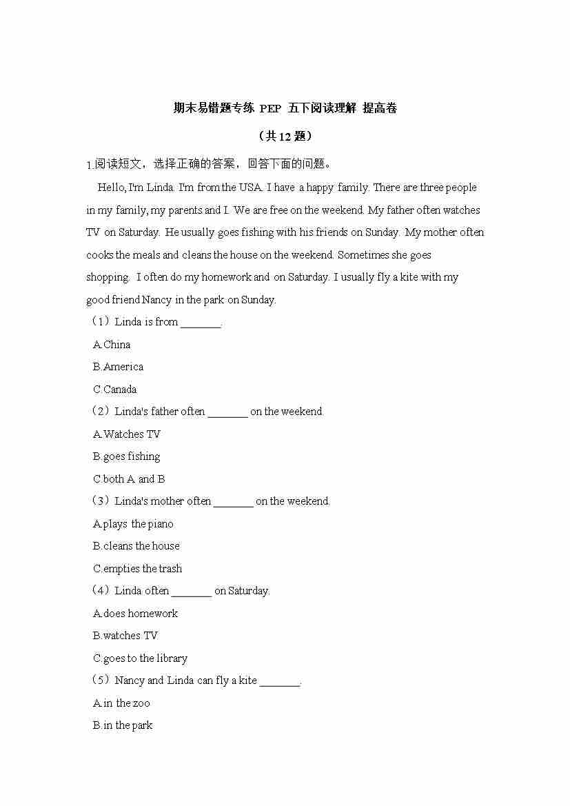 【期末易错题专攻】【提高卷】 五下英语阅读理解 (含答案 人教pep)_new