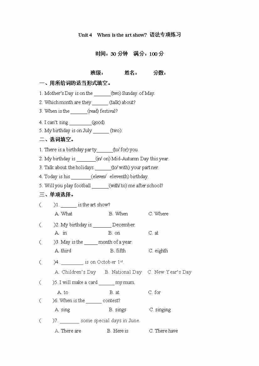 【核心语法】五年级下册英语语法专训-Unit 4 When is the art show 人教PEP(word版,含答案)_new