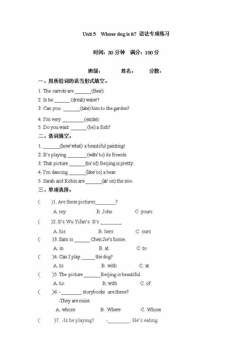 【核心语法】五年级下册英语语法专训-Unit 5 Whose dog is it 人教PEP(word版,含答案)_new