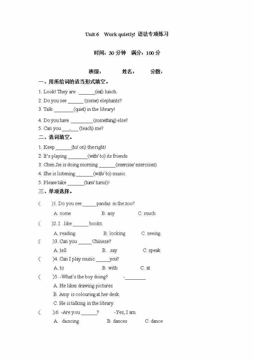 【核心语法】五年级下册英语语法专训-Unit 6 Work quietly 人教PEP(word版,含答案)_new