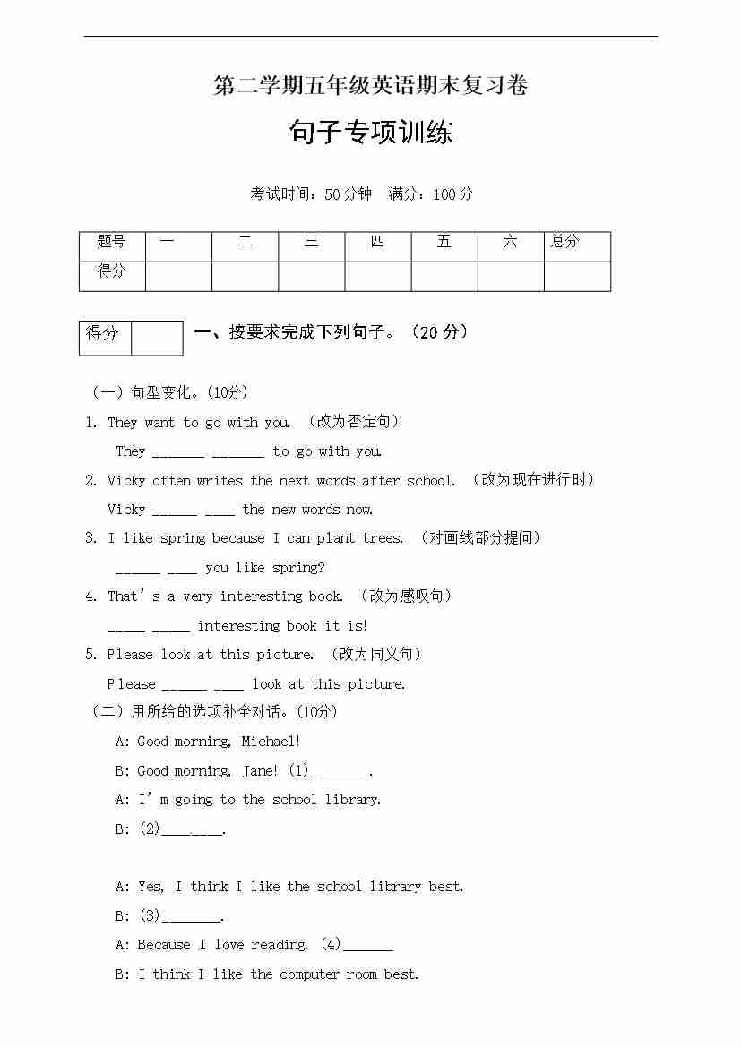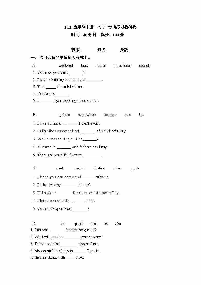 五年级下册英语期末专项卷-句子 人教PEP(word版,含答案)_new