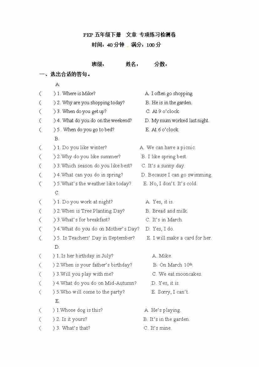 五年级下册英语期末专项卷-文章 人教PEP(word版,含答案)_new