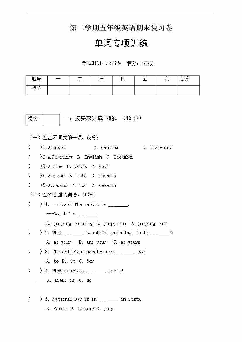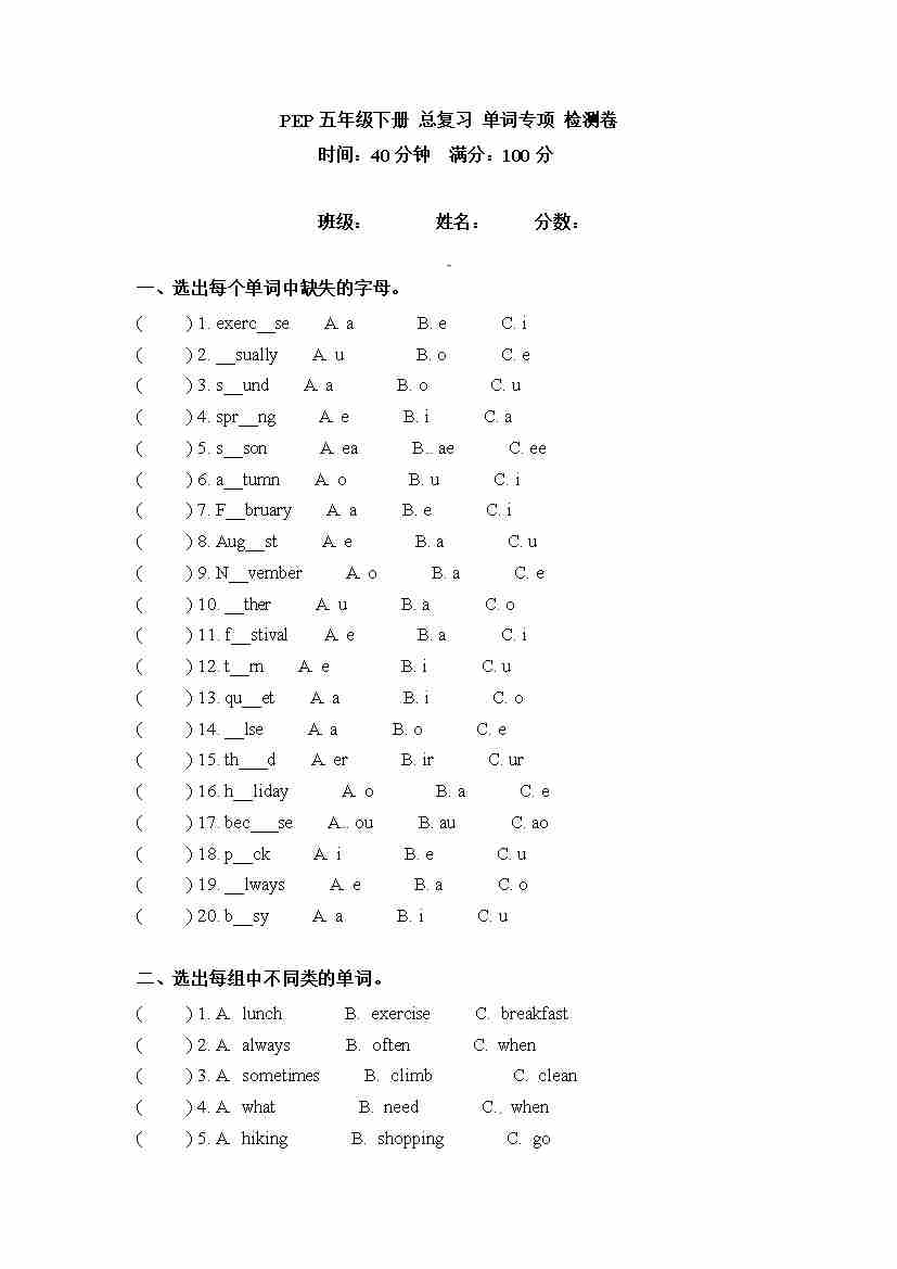 五年级下册英语期末专项卷-词汇 人教PEP(word版,含答案)_new