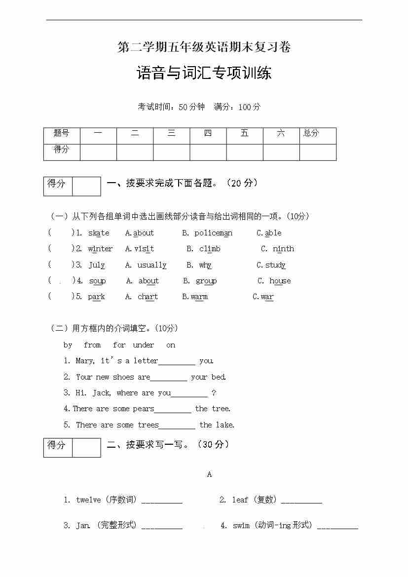 人教PEP版五年级英语下册期末专项训练-语音与词汇(word,含答案)