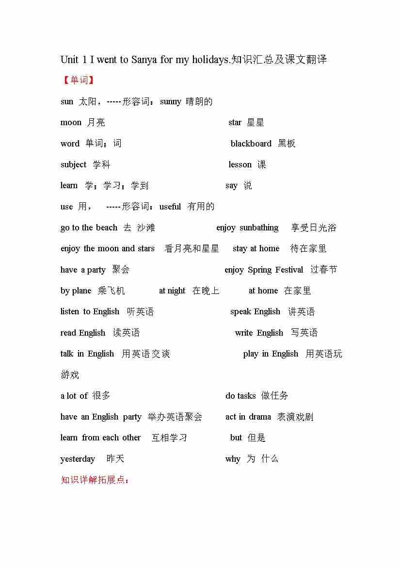 【精通版】六年级下册英语素材-Unit 1 I went to Sanya for my holidays知识汇总及课文翻译