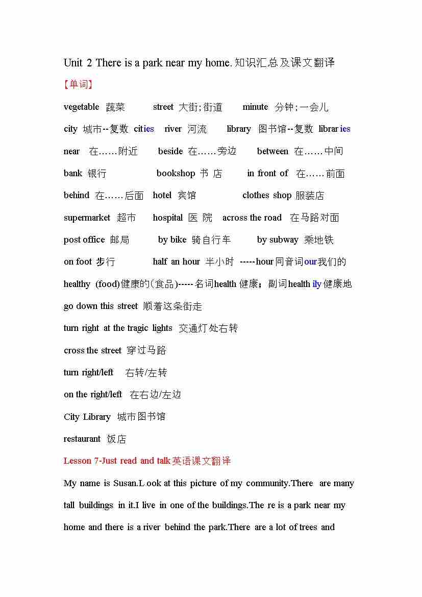 【精通版】六年级下册英语素材-Unit 2 There is a park near my home 知识汇总及课文翻译