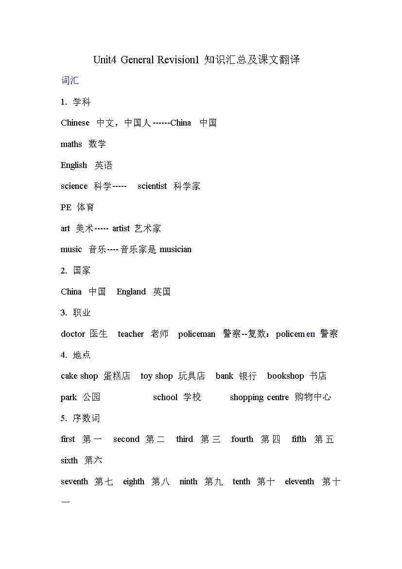 【精通版】六年级下册英语素材-Unit 4 General Revision1知识汇总及课文翻译