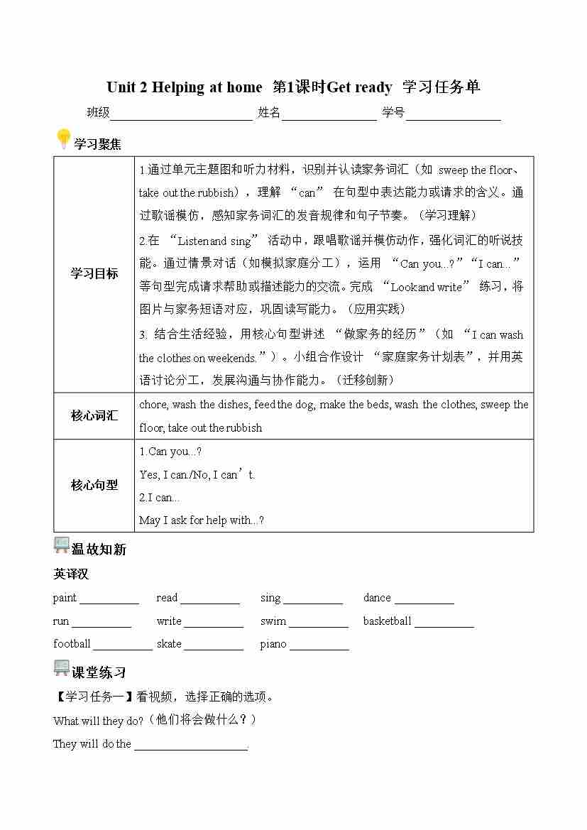 Unit 2 第1课时 Get ready(学习任务单)英语外研版三起四年级上册(新教材)