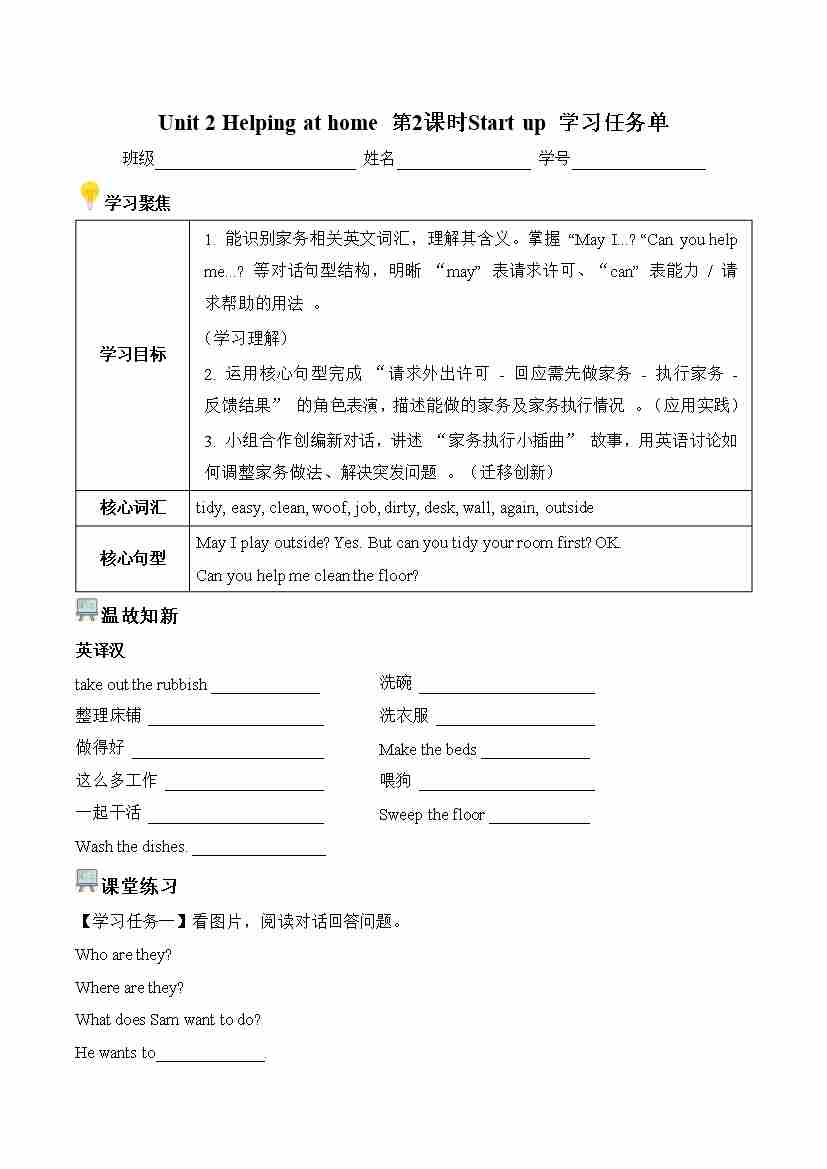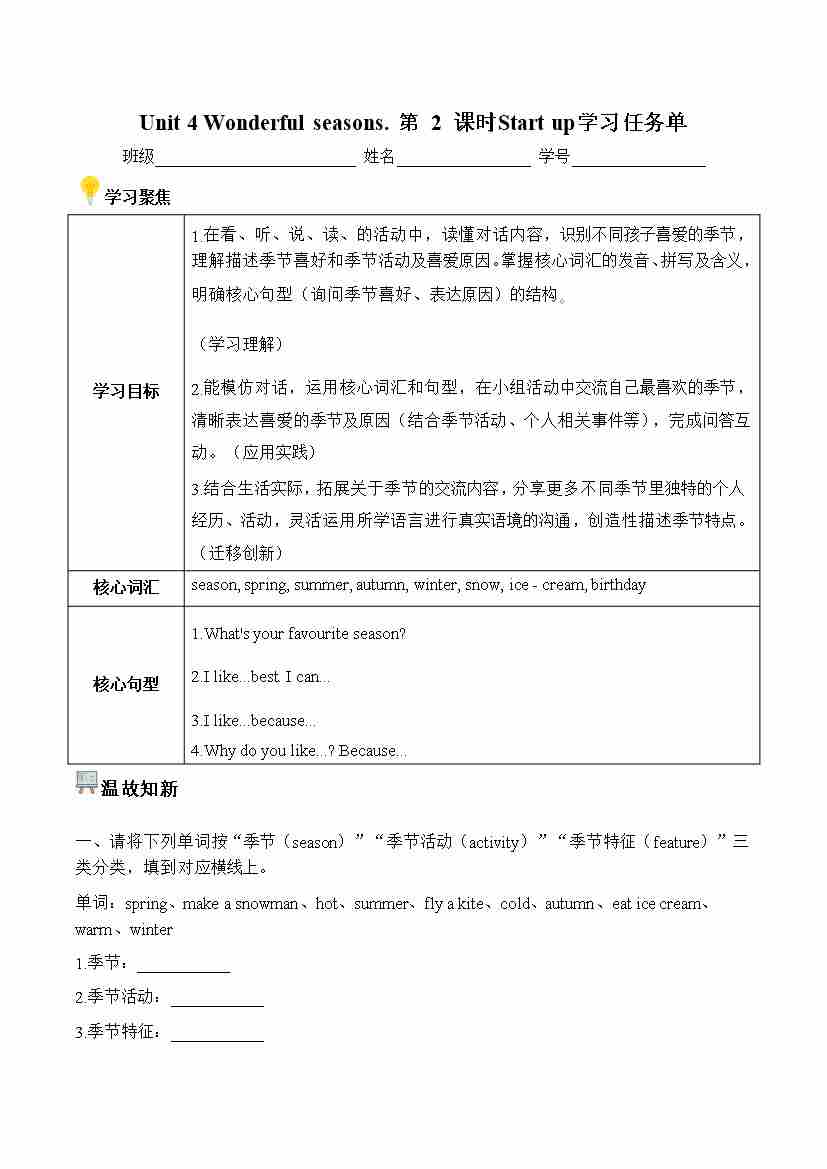 Unit 2 第2课时 Start up (学习任务单)英语外研版三起四年级上册(新教材)