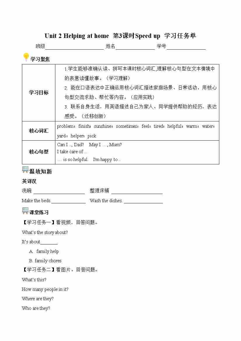 Unit 2 第3课时 Speed up(学习任务单)英语外研版三起四年级上册(新教材)