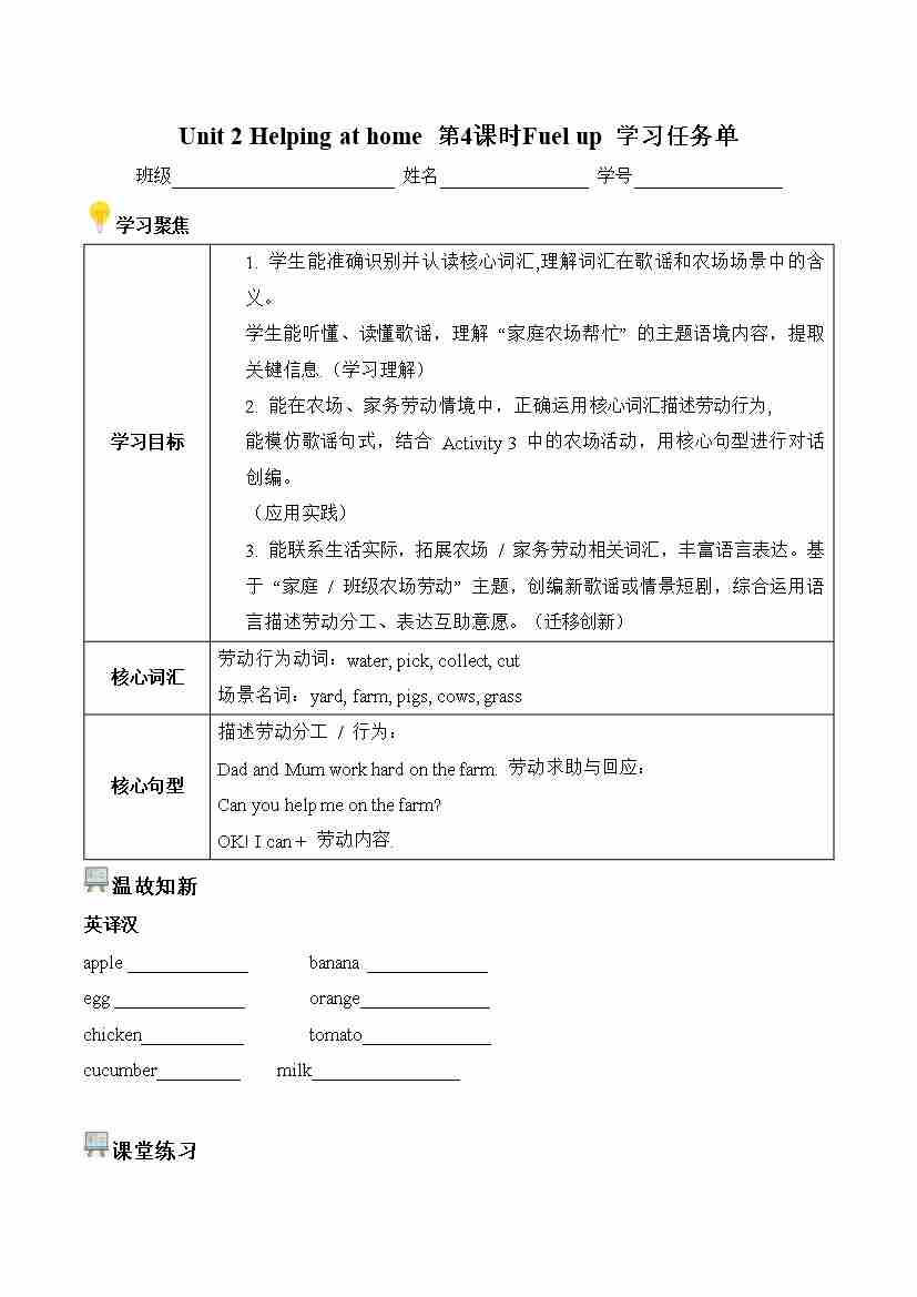 Unit 2 第4课时 Fuel up(学习任务单)英语外研版三起四年级上册(新教材)
