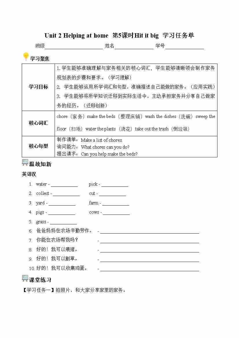 Unit 2 第5课时 Hit it big (学习任务单)英语外研版三起四年级上册(新教材)