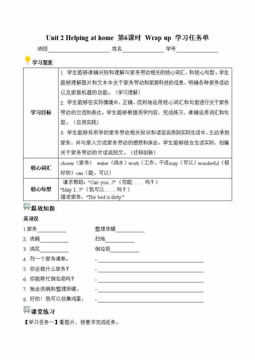 Unit 2 第6课时 Wrap up (学习任务单)英语外研版三起四年级上册(新教材)