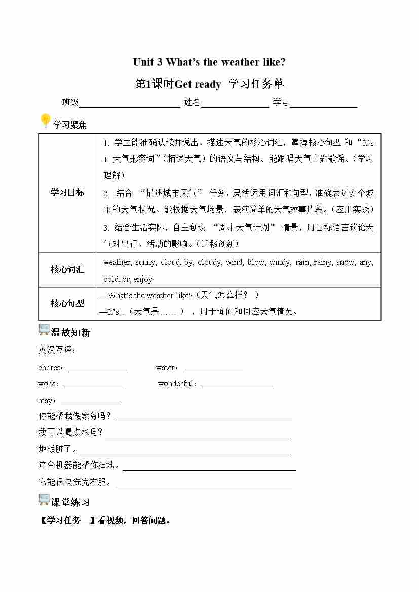 Unit 3 第1课时 Get ready(学习任务单)英语外研版三起四年级上册(新教材)
