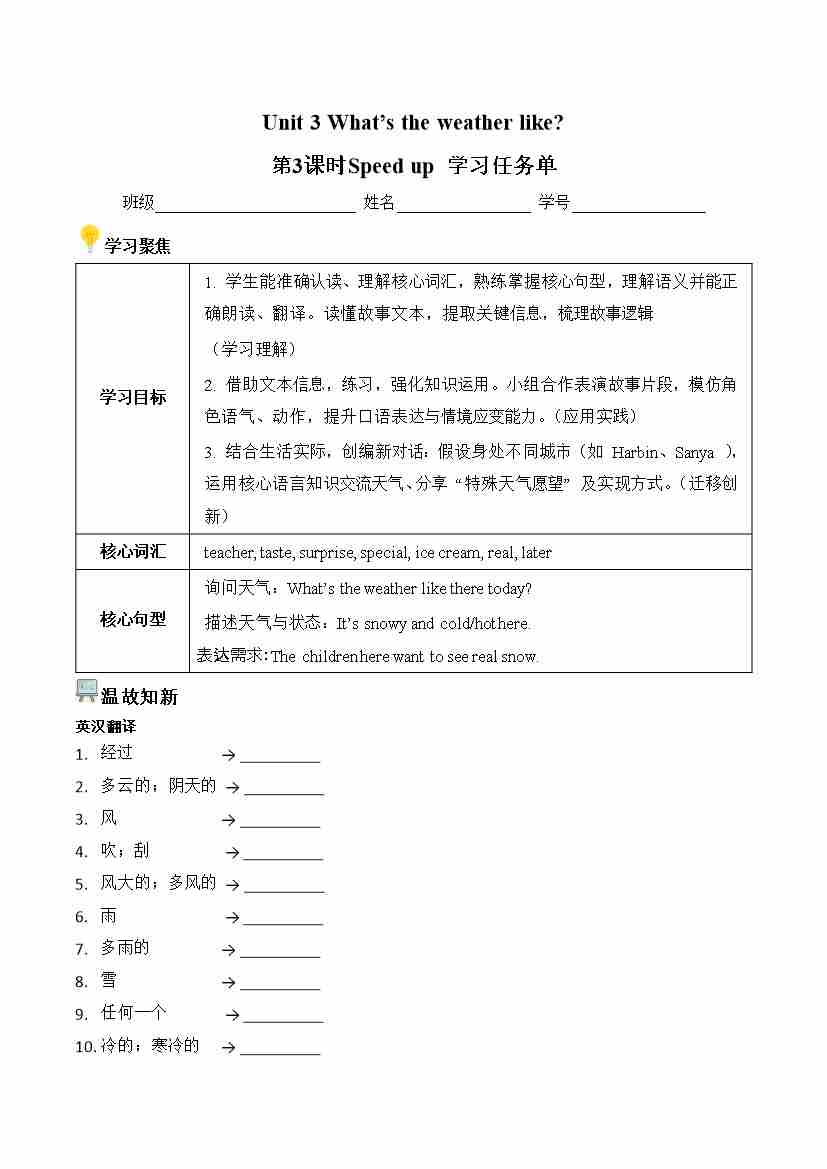 Unit 3 第3课时 Speed up(学习任务单)英语外研版三起四年级上册(新教材)