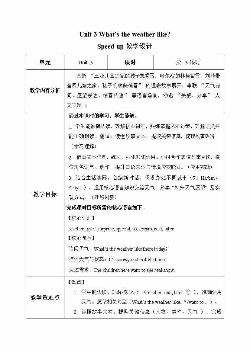 Unit 3 第3课时 Speed up(教学设计)英语外研版三起四年级上册(新教材)