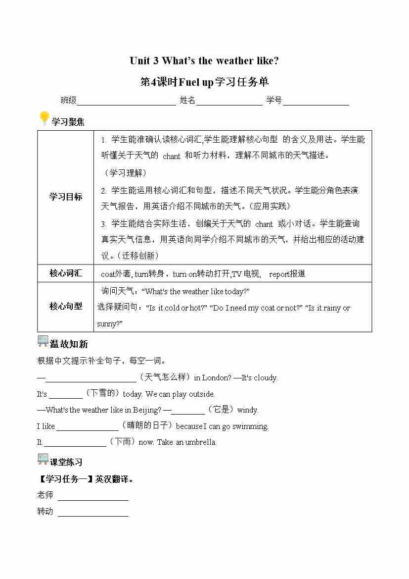 Unit 3 第4课时 Fuel up(学习任务单)英语外研版三起四年级上册(新教材)