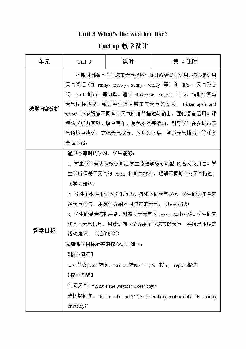 Unit 3 第4课时 Fuel up(教学设计)英语外研版三起四年级上册(新教材)