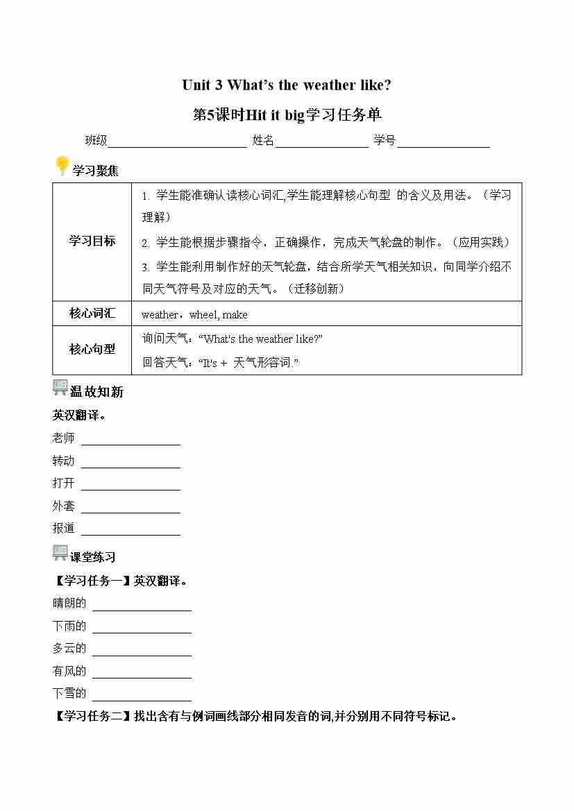Unit 3 第5课时Hit it big (学习任务单)英语外研版三起四年级上册(新教材)
