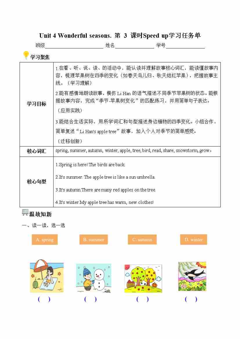 Unit 4 第 3 课时Speed up(学习任务单)英语外研版三起四年级上册(新教材)