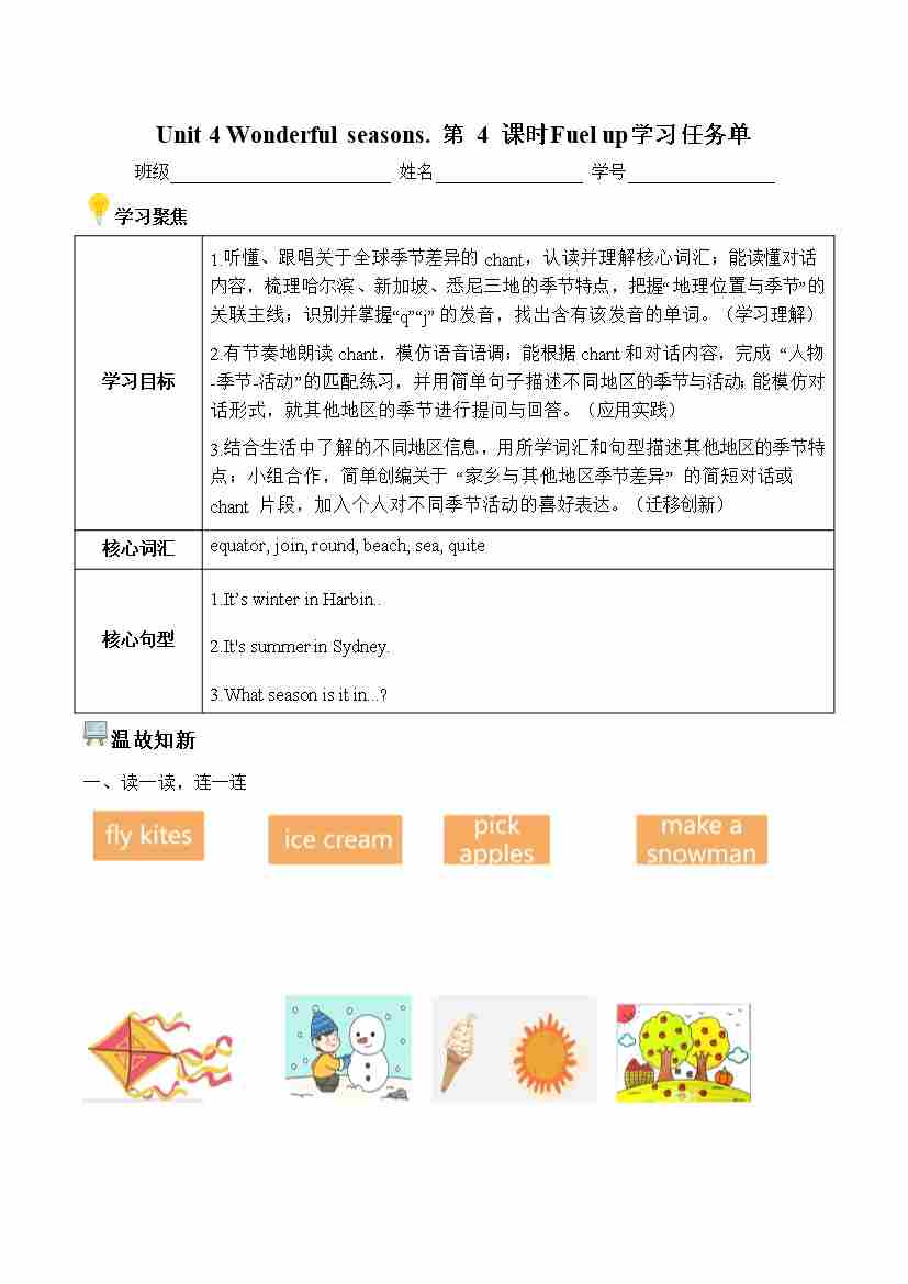 Unit 4 第 4 课时 Fuel up(学习任务单)英语外研版三起四年级上册(新教材)