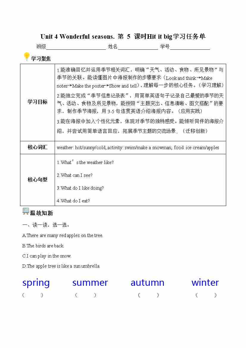 Unit 4 第 5 课时 Hit it big(学习任务单)英语外研版三起四年级上册(新教材)