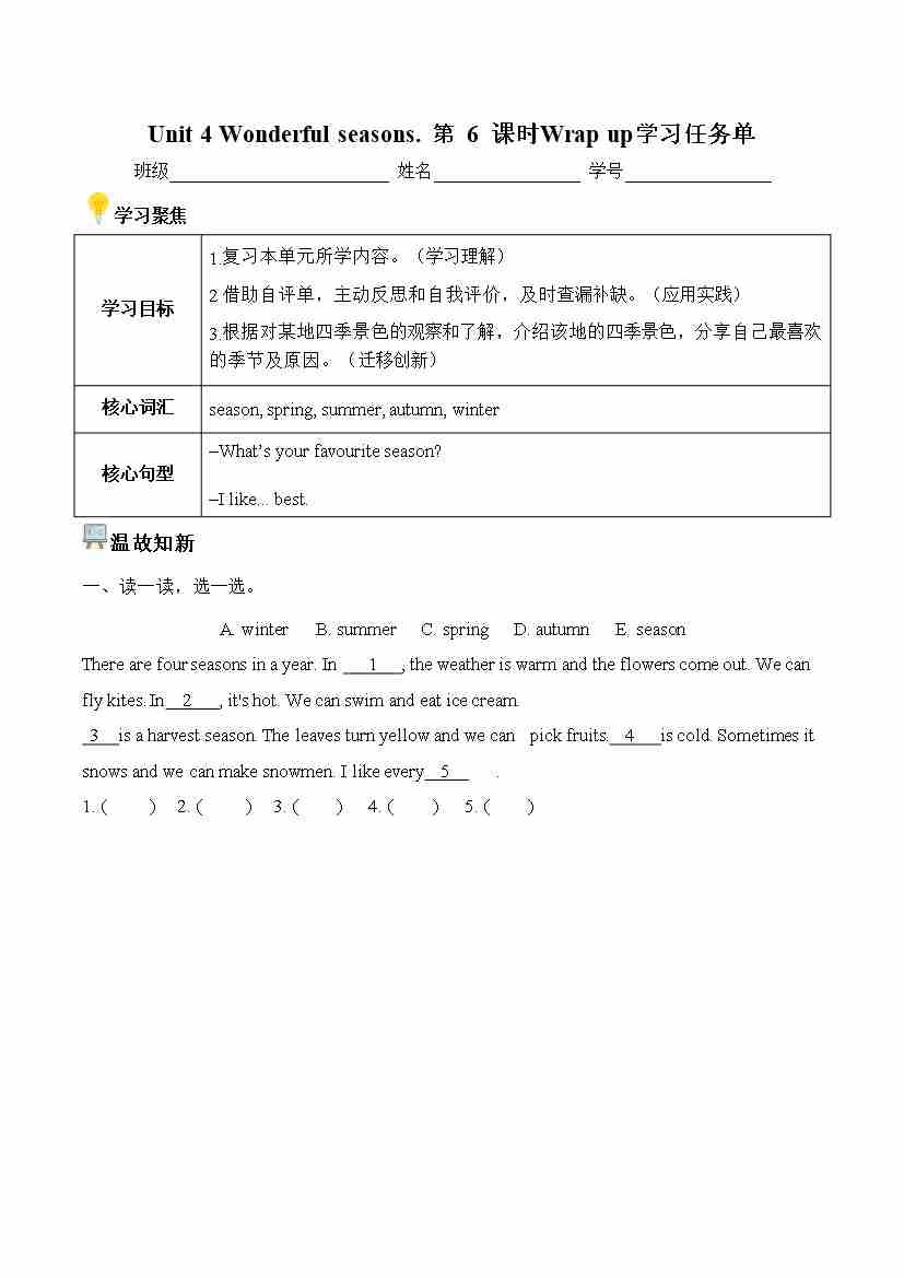Unit 4 第 6 课时Wrap up(学习任务单)英语外研版三起四年级上册(新教材)