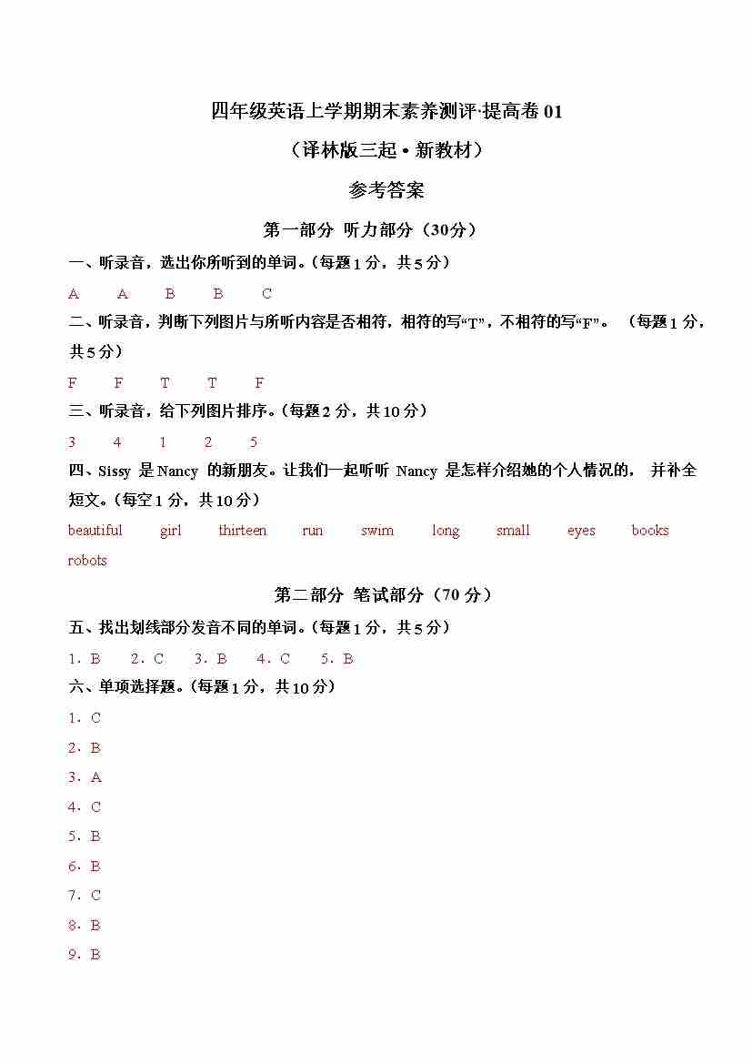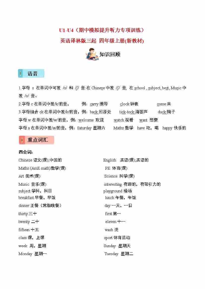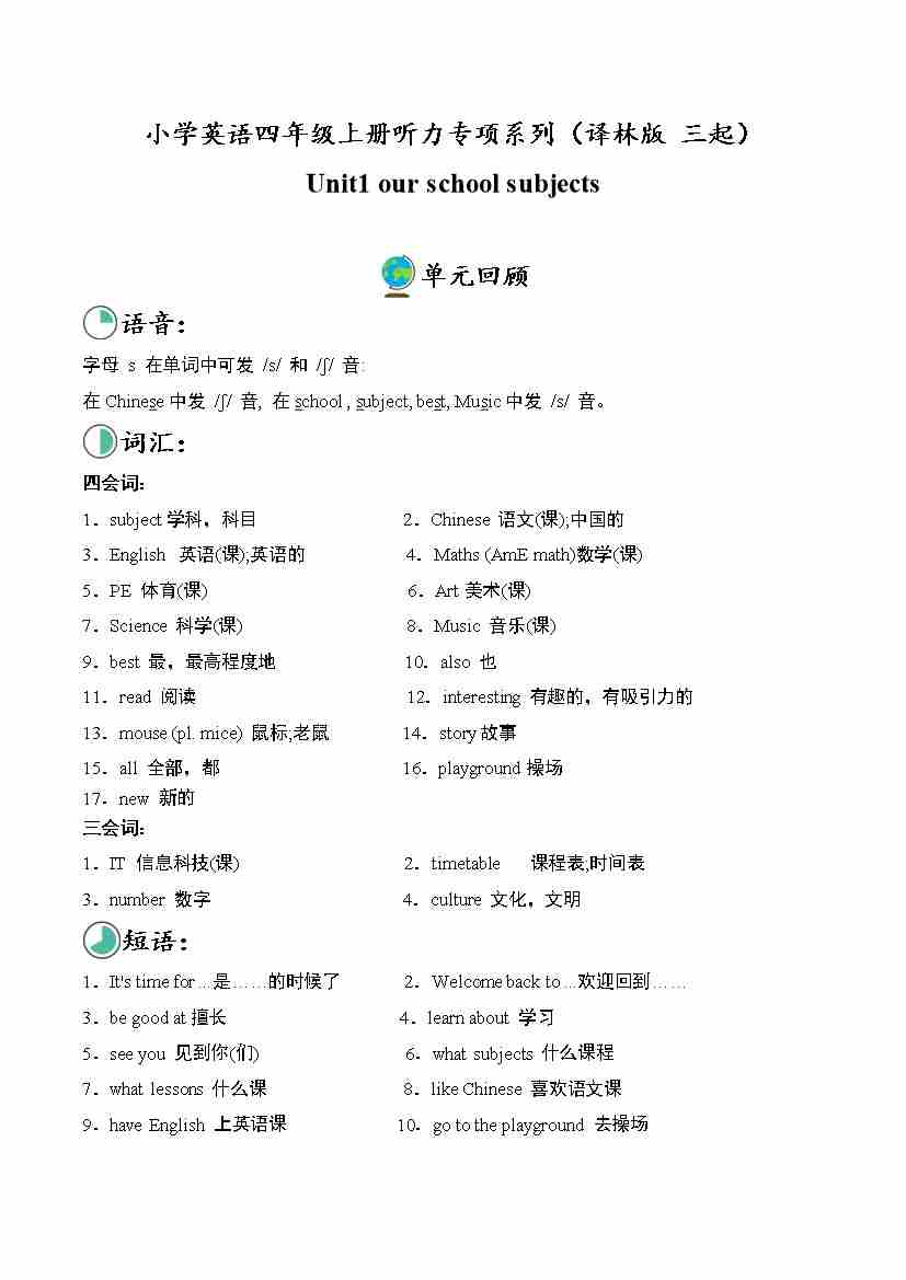 Unit 1 Our school subjects (单元听力专项训练)英语译林版三起四年级上册(新教材)