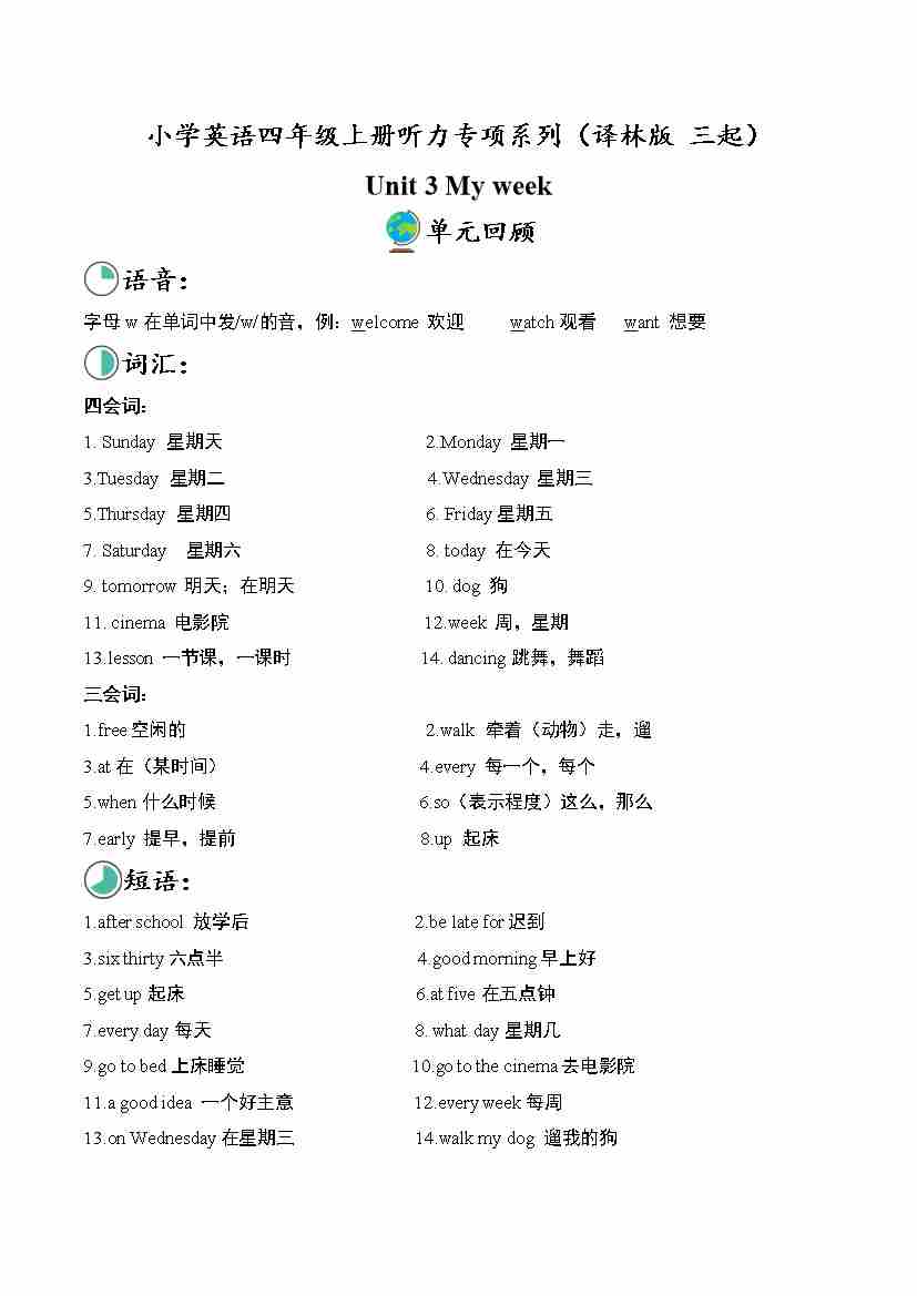 Unit 3 My week(单元听力专项训练)英语译林版三起四年级上册 (新教材)