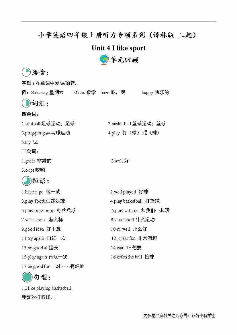 Unit 4 I like sport(单元听力专项训练)英语译林版三起四年级上册(新教材)