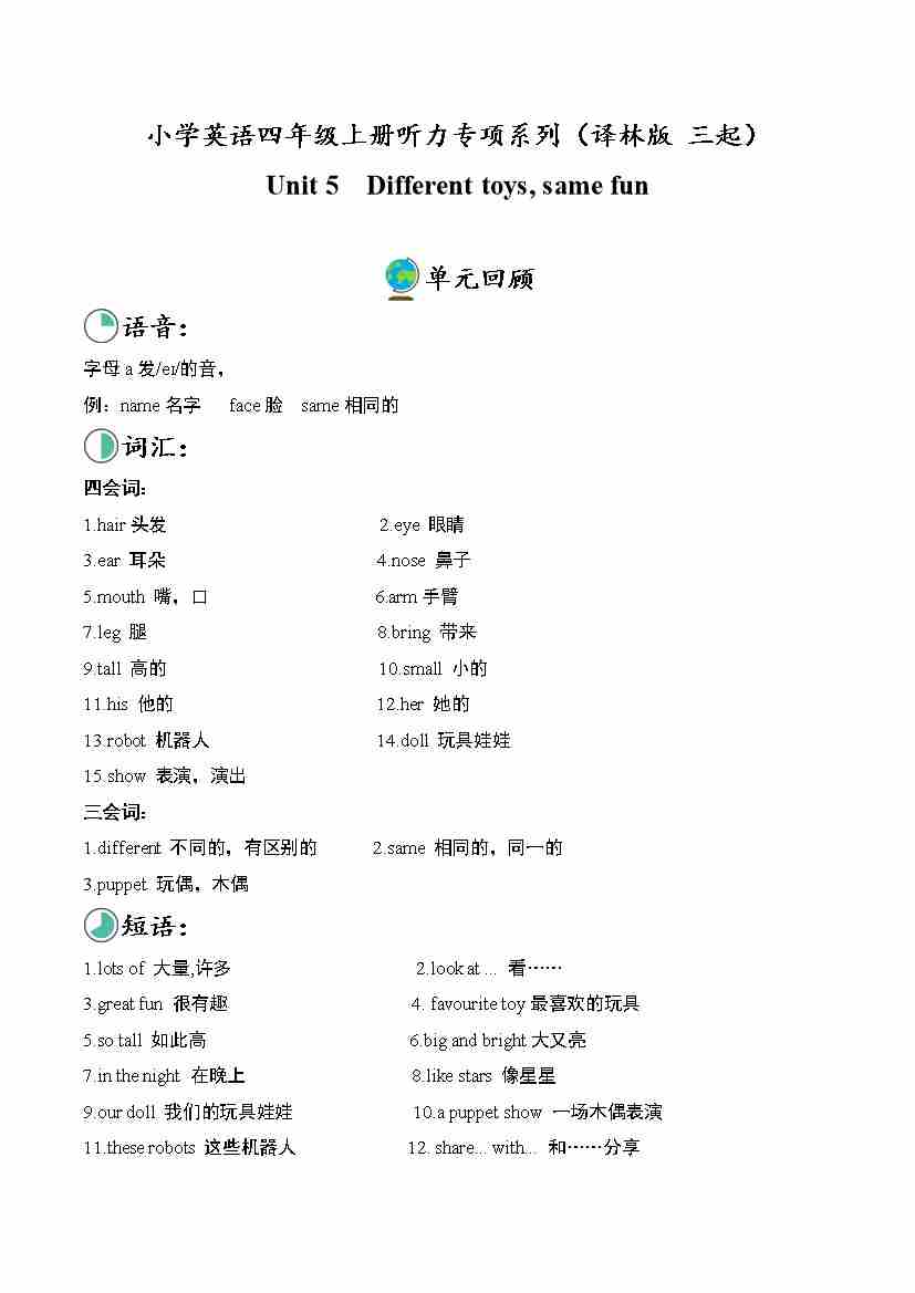 Unit 5 Different toys, same fun (单元听力专项训练)英语译林版三起四年级上册(新教材)