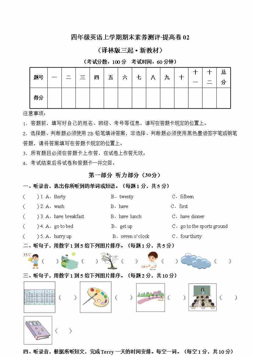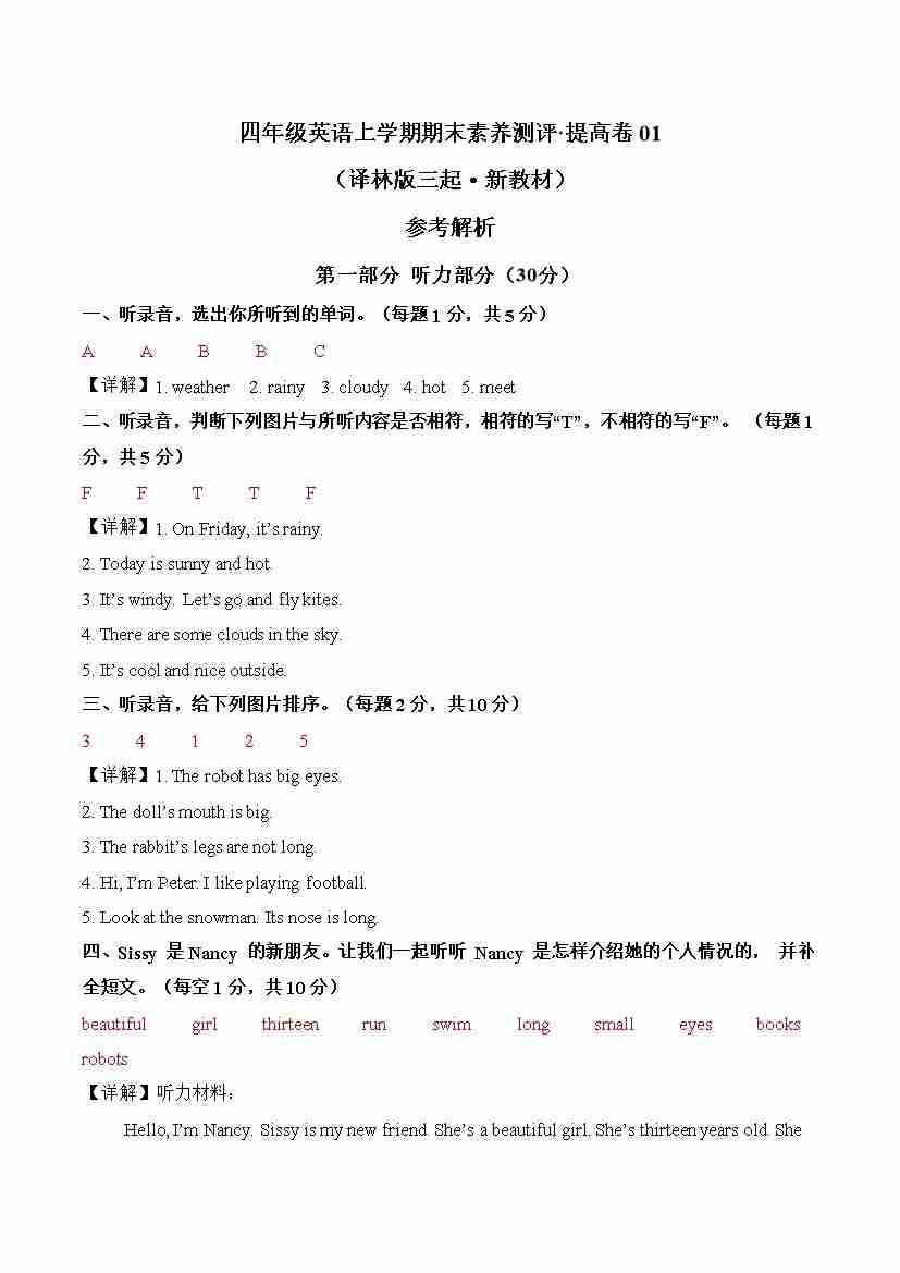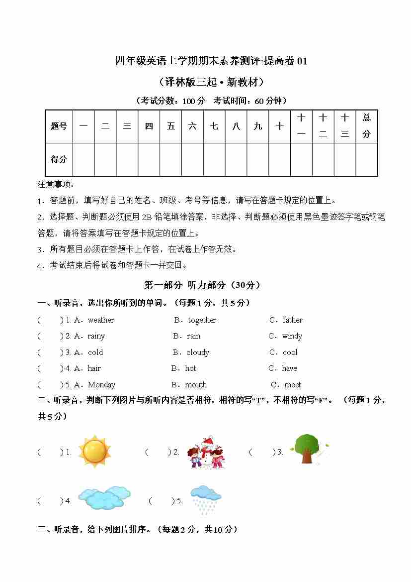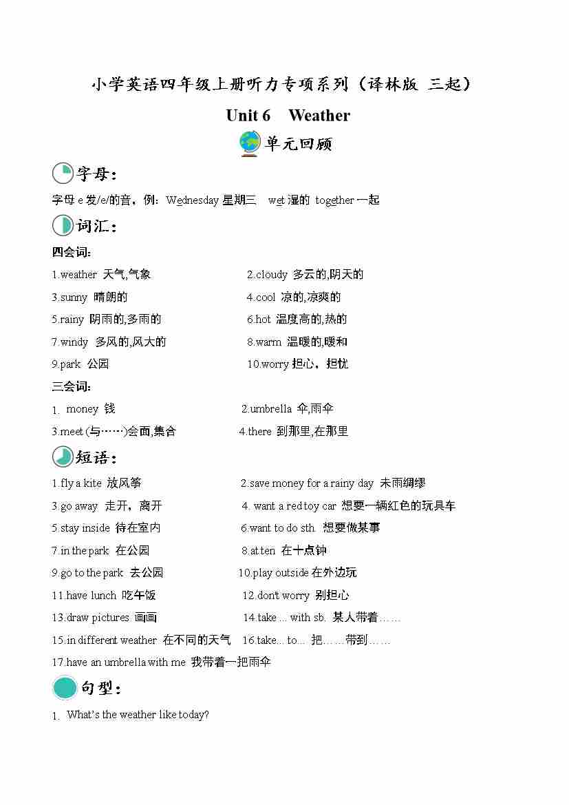 Unit 6 Weather (单元听力专项训练)英语译林版三起四年级上册(新教材)