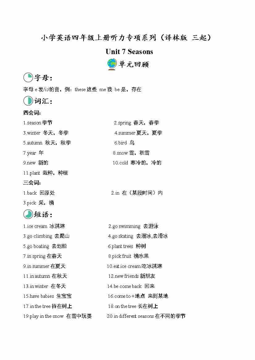 Unit 7 Seasons (单元听力专项训练)英语译林版三起四年级上册(新教材)