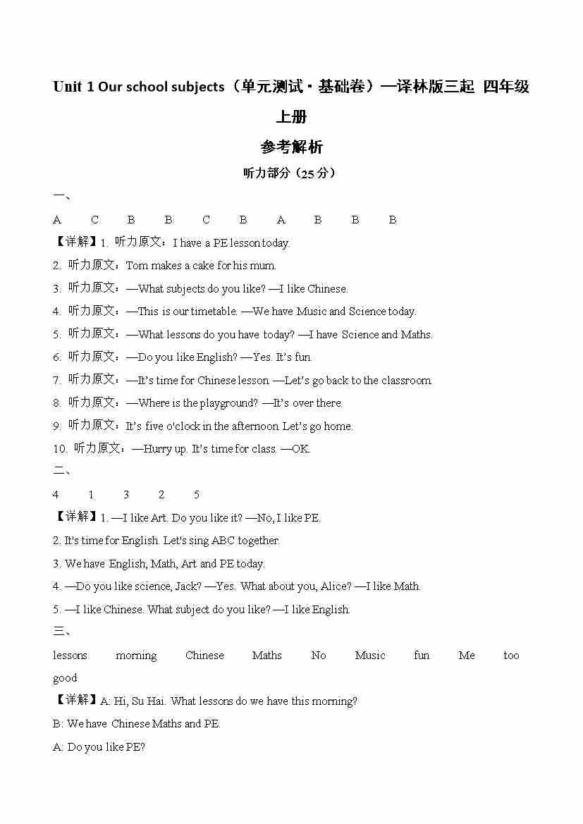 Unit 1 Our school subjects(参考解析)译林版三起 四年级上册(新教材)